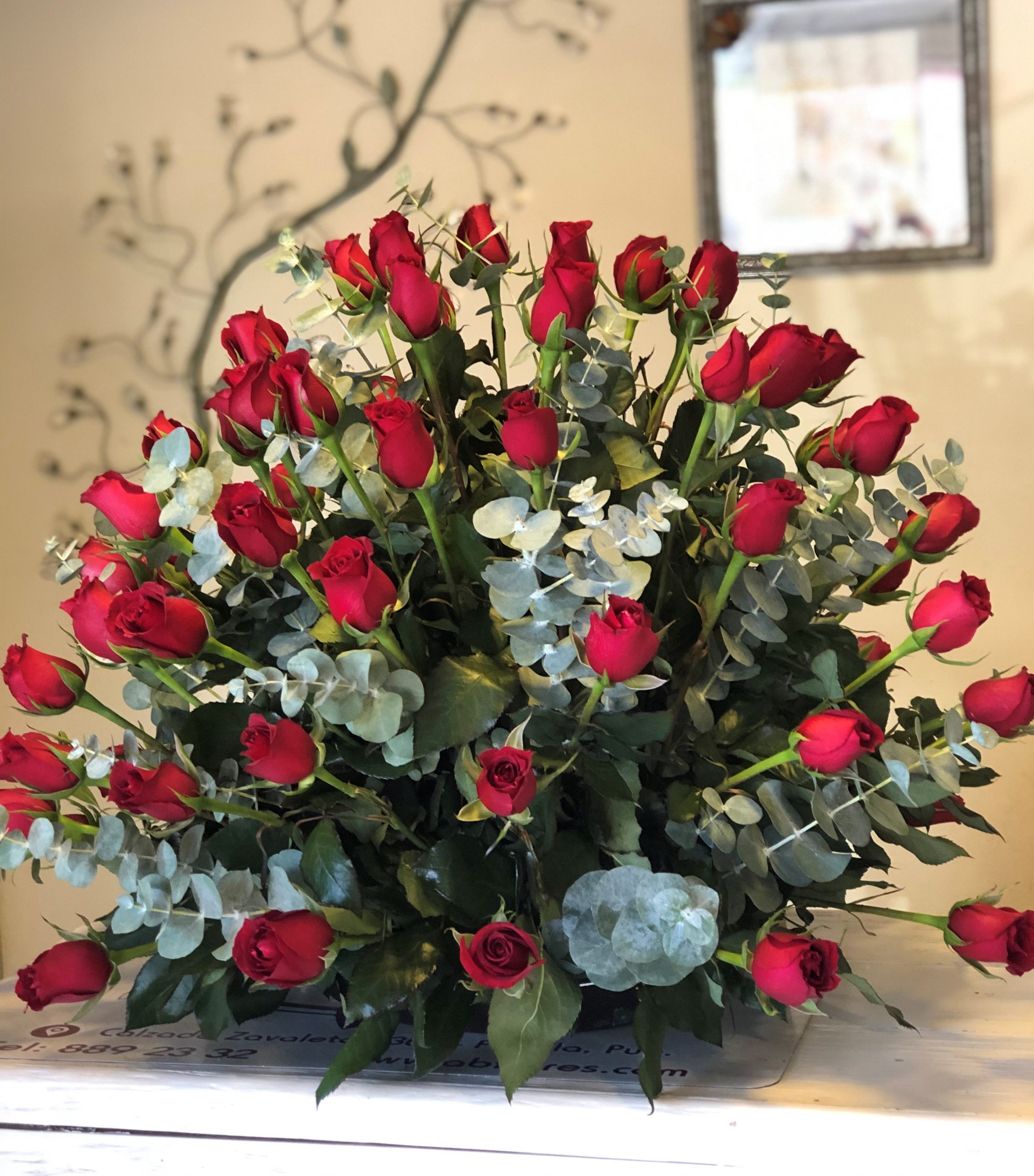 Arreglo floral con 100 rosas y follajes, colocado en una base de cerámica.