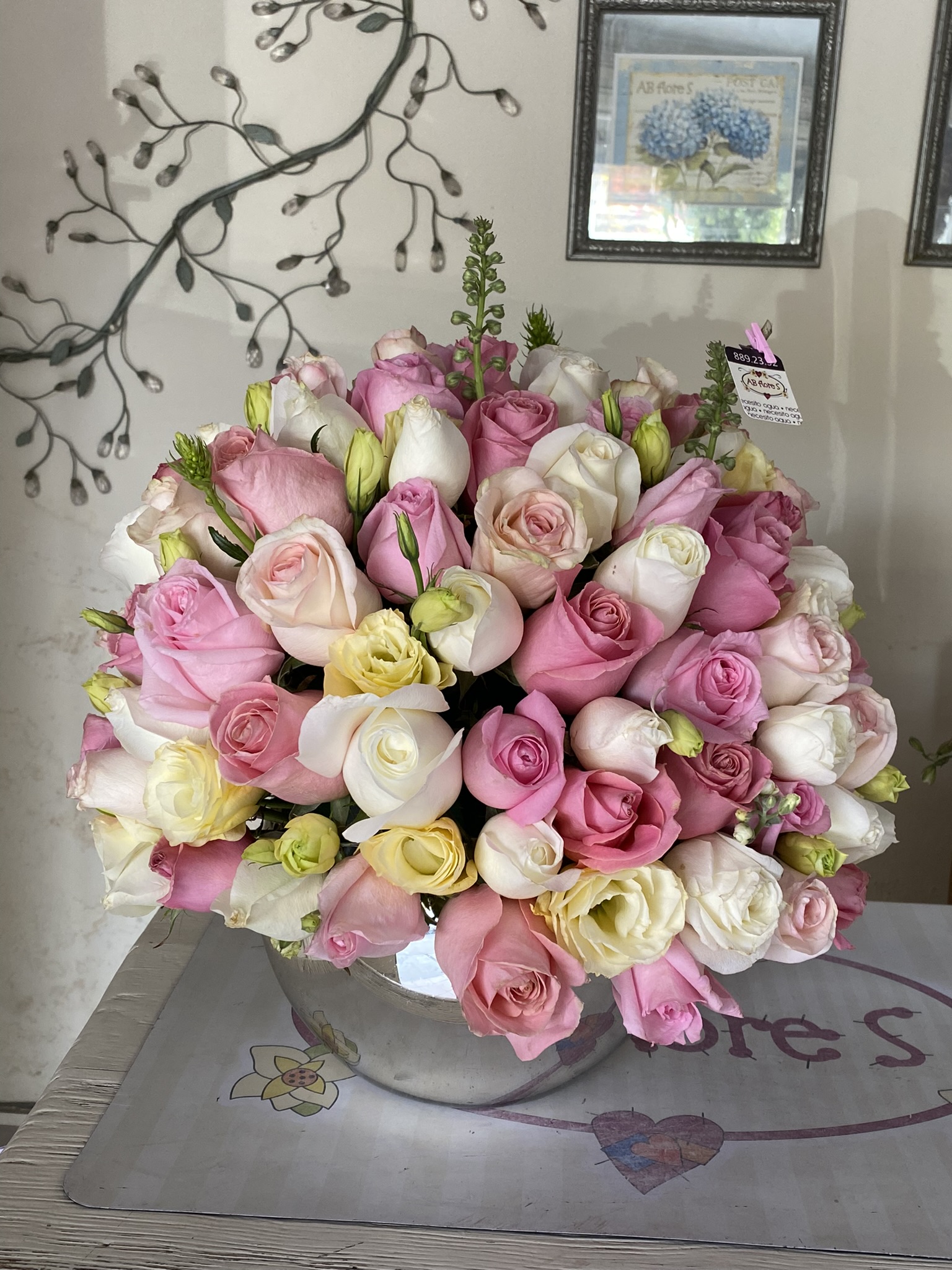 Arreglo de rosas en tonos pastel en base de vidrio soplado.