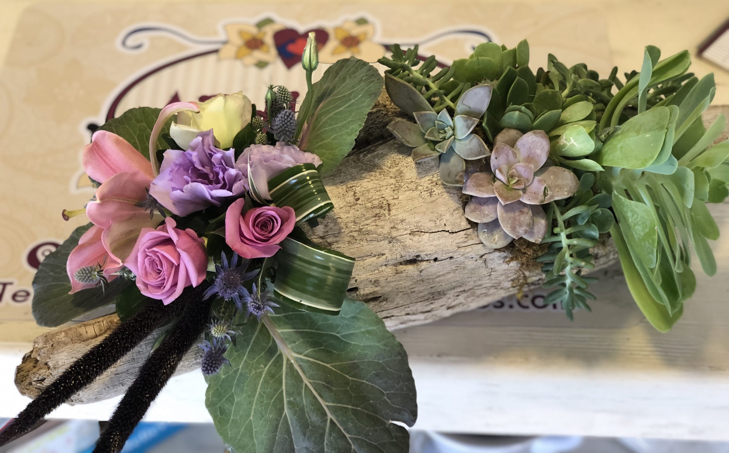 Arreglo de suculentas variadas, colocado en un tronco, con rosas, cuetes, lisianthus y lilis.