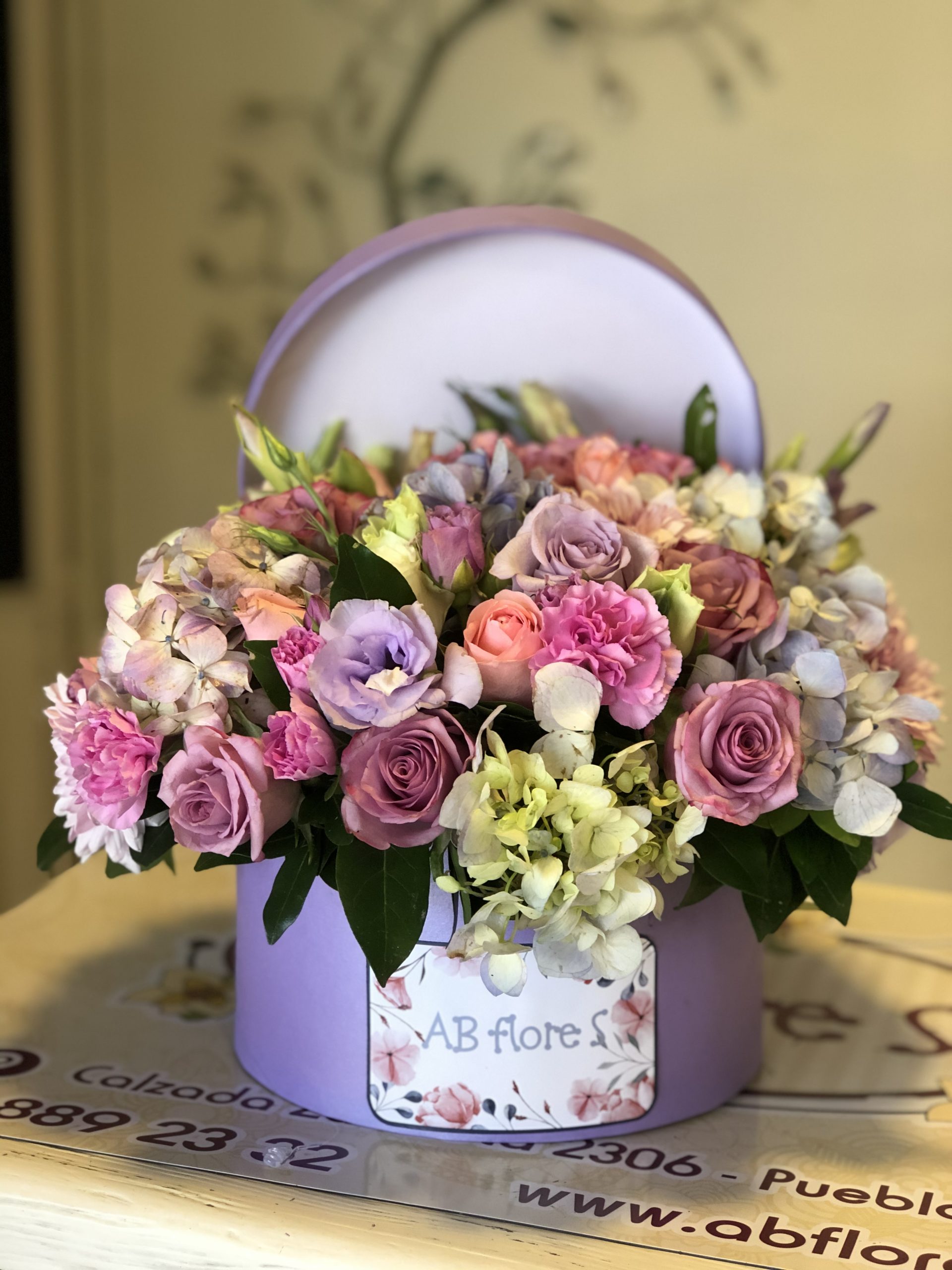 Arreglo estilo vintage en caja redonda tonos lila, con rosas, hortensias, claveles, roxanas y lisianthus, colocado en una caja de cartón con tapa.